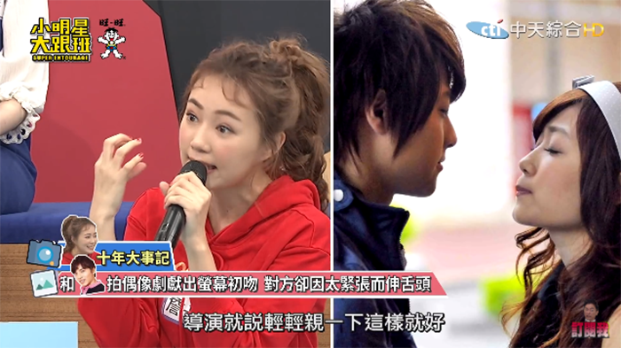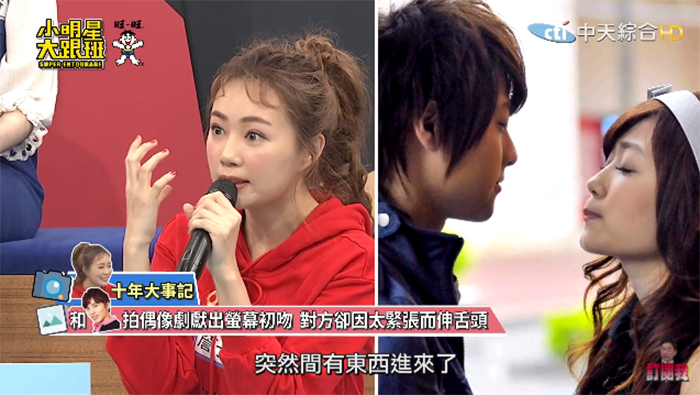 當時黑澀會與棒棒堂一起合拍偶像劇,當時她和阿緯及王子都有感情戲,後來將螢幕初吻獻給了阿緯,但卻發生了一件糗到不行的事。由於當時兩人都很緊張,導演特別交代,因為是校園偶像劇,只需要輕輕地親一下就好,展現出浪漫又青澀的感覺。