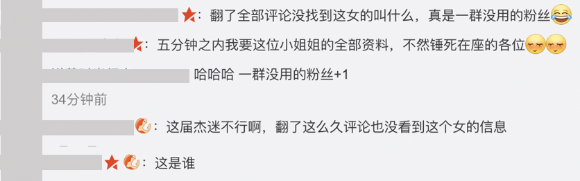 在將近200個評論中,沒有一人找出這位女生的身份,如此神秘的女子,也引發網友們好奇,紛紛留言表示:「翻了全部評論沒找到這女的叫什麼,真是一群沒用的粉絲」、「五分鐘之內我要這位小姐姐的全部資料,不然錘死在座的各位」、「這屆杰迷不行啊,翻了這麼久評論也沒看到這個女的信息」、「這是誰」、「哈哈哈 一群沒用的粉絲」,底下有許多有趣的評論。