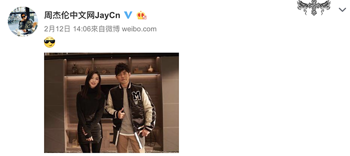 而周杰倫本人雖然沒有使用微博,但他的粉絲後援會也成立了一個帳號,專門分享周杰倫的近況消息,此後援會也擁有224萬人追蹤,粉絲們也非常希望周杰倫能夠開設微博,和大陸的粉絲們互動。而在12日時,粉絲團發出一張周杰倫和一名女子合照的照片,並附上戴墨鏡的表情符號,也引發網友們熱議,因為完全沒有任何一人找到這位女生的相關資訊。