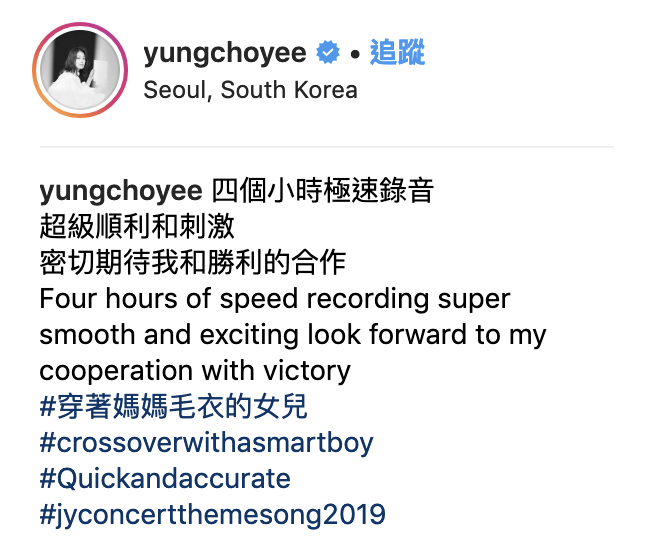 昨日,容祖兒在個人IG上發出一組和韓國天團BIGBANG成員「勝利」的合照,並寫下:「四個小時極速錄音,超級順利和刺激,密切期待我和勝利的合作」,容祖兒親自飛到韓國和勝利會面,也讓粉絲相當期待兩個天王、天后等級的跨國合作,而勝利前陣子開設的酒吧也發生一些醜聞,事發至今約兩週的時間,勝利在照片中面帶笑容,心情似乎未受太大的影響。