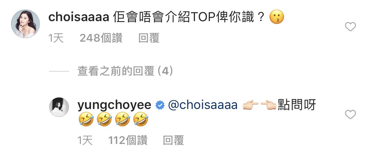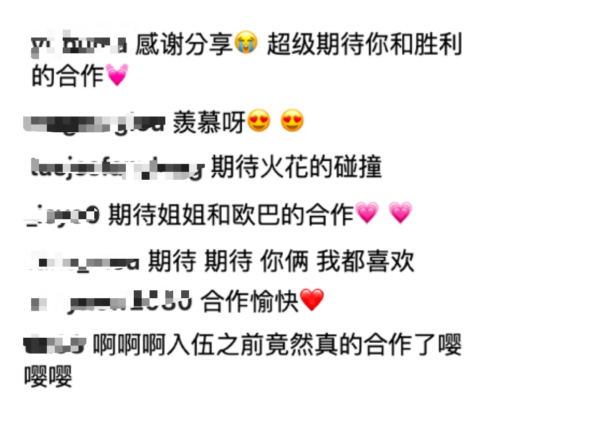 而好友「阿Sa」也在下方留言:「他會不會介紹TOP給你認識?」,容祖兒也回覆:「怎麼問呀」,相當逗趣,而網友們看見她和勝利的合照後也紛紛留言:「羨慕呀」、「期待火花的碰撞」、「超級期待你和勝利的合作」、「期待姐姐和歐巴的合作」、「啊啊啊入伍之前竟然真的合作了」、「合作愉快」、「期待 期待 你倆 我都喜歡」,粉絲們都相當興奮。