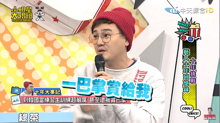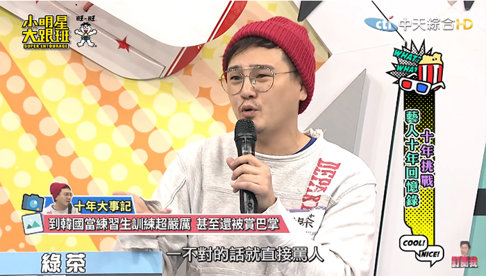 回想起那段練習生的日子簡直是慘不忍睹,只要不小心講錯話就直接飆罵,生活、情緒完全被壓抑。綠茶透露,某次他去錄了一首歌,因為聽了成果後發現音準有些問題,公司希望直接用調音的,但綠茶希望能重唱一次。沒想到他只是給了一點意見,就被帶到外面,在冰天雪地酷寒的天氣下,綠茶直接被抓出去狠狠地賞了一巴掌,「他說不能有意見,他說你完全沒有給我台階下!」
