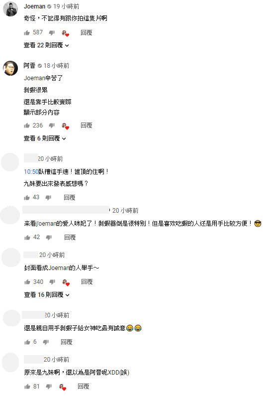 而影片發布後,九妹則搞笑留言:「奇怪,不記得有跟你拍這隻片啊」,阿晋也說道:「Joeman辛苦了 剝蝦很累 還是靠手比較實際」,故意身分對調。其他網友也打上:「封面看成Joeman的人舉手」、「原來是九妹啊,還以為是阿晉呢XDD(誤)」,話題都圍繞在超相似的兩人身上,只能說咪妃這次的合作真的十分讓人印象深刻。
