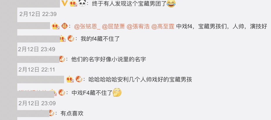 而大陸網友們也稱這四人為「寶藏男孩」,這詞也意指自己喜歡的明星身上,有很多才華慢慢被世人發現,就像挖寶一樣,而中戲F4皆是新生代演員,也讓大家相當期待他們未來的戲劇發展。
