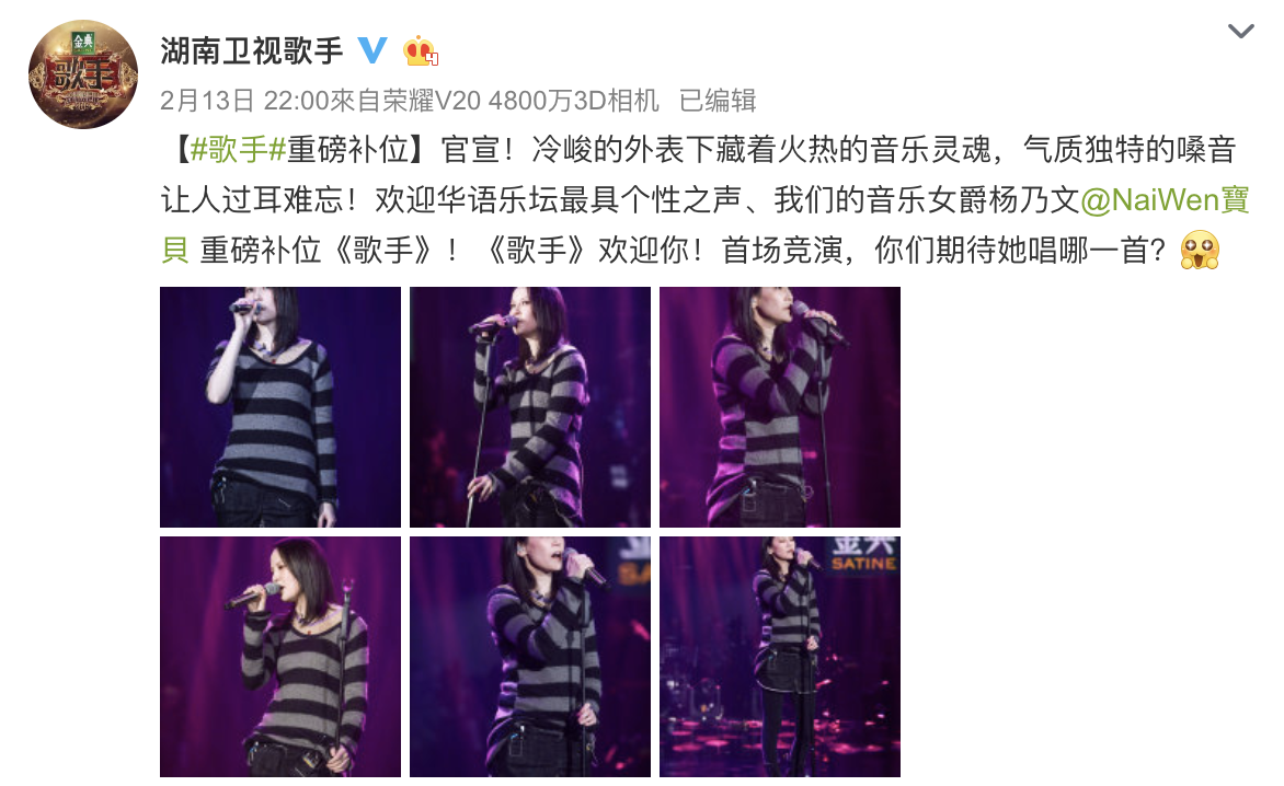 節目再淘汰選手後,會進行補位的動作,在13日時,官方也正式宣布金曲歌后「楊乃文」補位加入,而根據PTT網友討論說道:「《歌手》總導演洪濤曾親自蒞臨楊乃文演唱會欣賞,並當面向楊乃文提出參賽邀約,不意外地被一口回絕」,而此次歌后答應親征參賽,也讓大家非常期待,紛紛留言表示:「期待」、「上次上蒙面就很意外了 居然要上歌手」、「歌手怎麼越來越好看的感覺哈哈」、「這個有興趣多了,本屆最有興趣的」、「我要看女爵」