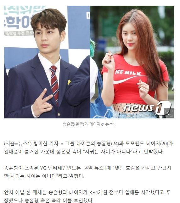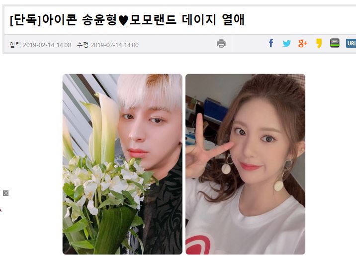 14日,韓媒《首爾體育》報導指出iKON 24歲成員宋允亨和女團MOMOLAND 20歲的成員Daisy已經密戀有超過3個月時間,據悉,兩人原先是尊敬的前後輩,之後才漸漸發展成情侶關係,此外,交往期間宋允亨和Daisy已經多次約會,文中顯示「兩人雖忙於工作,不過一有空閒就會見面」。