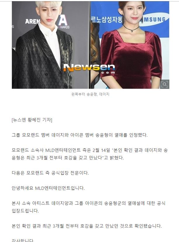 14日適逢西洋情人節,韓國偶像圈又再度傳出戀情,根據韓國媒體《首爾體育》報導,YG娛樂旗下男團iKON 的門面宋允亨和MLD娛樂女團MOMOLAND的Daisy驚傳已經默默交往3到4個月,目前女方經紀公司出面表示,正在向Daisy確認真實狀況,消息一出也震驚外界。