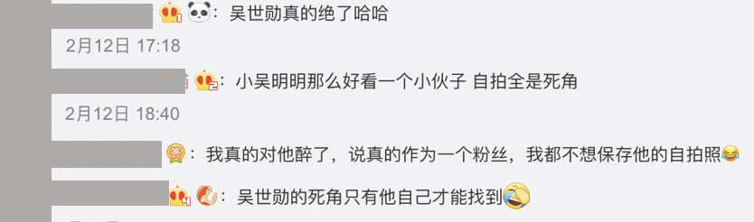 除了吳世勳之外,范丞丞也同樣是網友熱議的對象,楊洋、易烊千璽、王源等眾多男神們也都被提名,且每個人都有自己拍照時獨有的風格,易烊千璽自拍時就很喜歡把鼻孔朝向鏡頭;而楊洋則是沒有太多角度的,直接平面拍攝;范丞丞則是喜歡在自拍時擺出怪表情,十分逗趣。博主發出一張范丞丞對著鏡子自拍,一時之間很難辨認出是誰,網友也紛紛留言表示:「范丞丞是自己的黑粉」、「哈哈哈 范丞丞自黑第一」、「范丞丞贏了」