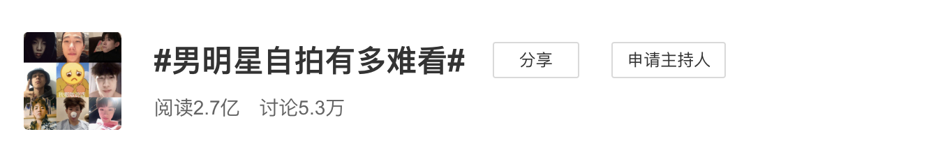 近日微博熱搜榜上充斥著許多有趣的話題,像是前幾日的「不適合演古裝的演員」,此話題就引起1.6萬的討論以及2億的閱讀量,相當驚人,而在昨日又有一個奇特的話題登榜「男明星自拍有多難看」,這次的討論量更是增加到了5.3萬,網友們也紛紛貼出明星自拍與他拍的對比照,吸引許多人圍觀吐槽。