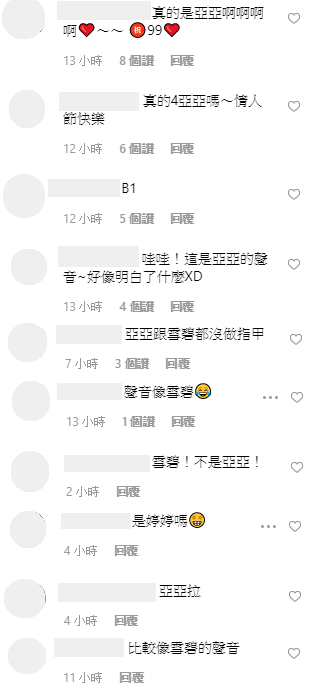 只見有不少網友憑著聲音猜測女方就是同為在不瘋狂就等死的成員「亞亞」,「真的是亞亞啊啊啊啊」、「真的4亞亞嗎~情人節快樂」、「這是亞亞的聲音~好像明白了什麼」,不過也有網友猜測可能是婷婷或是雪碧,不過否希則沒有回應。