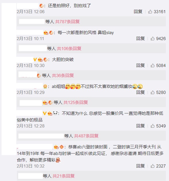有網友表示「我不太喜歡她的煙燻妝」、「不知道為什麼 總感覺一股廉價風 一直覺得她是那種低俗美中的極品」對於這次Angelababy的造型給予相當低的評價,但是對於這次Angelababy的大膽挑戰,網友們仍是好評居多,紛紛說「每一次都是新的風格」、「大膽的突破」、「真好看 每一封都是不一樣的風格」、「baby拍片就是美麗高級」、「煙熏妝也hold住啊!超級棒」看來Angelababy精緻的五官、完美的臉型無論搭配怎樣的造型都能完美駕馭阿!