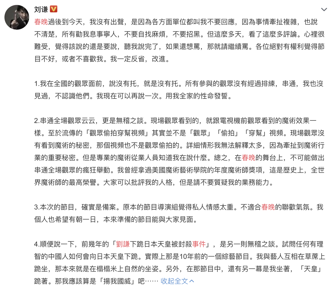 事件延燒了11日後,在今天早上劉謙終於出面解釋,寫下:「所有參與的觀眾沒有經過排練,串通,我也沒見過,不認識他們。我現在可以再說一次。用我全家的性命發誓」、「串通全場觀眾云云,更是無稽之談。現場觀眾看到的,就跟電視機前觀眾看到的魔術效果一樣」,多次嚴正強調毫無串通一說,許多網友們也紛紛力挺劉謙。