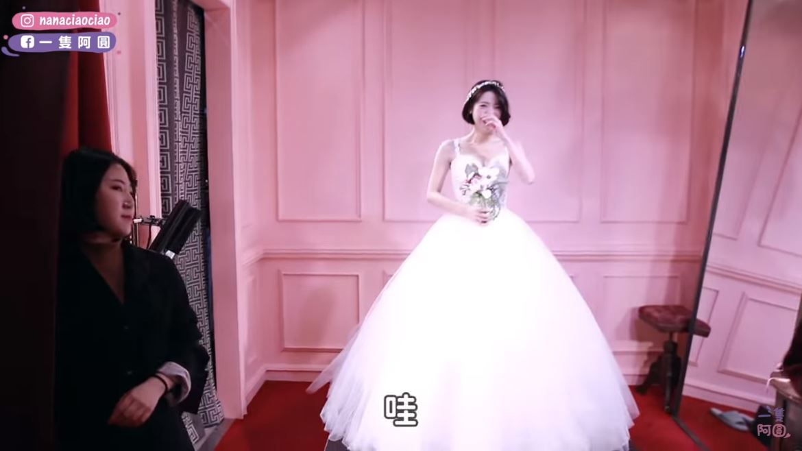 影片一開始,就由「阿圓」的男友米鹿慎重的開場,讓「阿圓」直呼「這樣我很緊張」,當拉簾一開「阿圓」的第一套婚紗隆重登場,「阿圓」身穿細肩帶的澎裙白色婚紗現身,看起來就像是個小公主一樣,讓男友也連連發出驚呼聲。