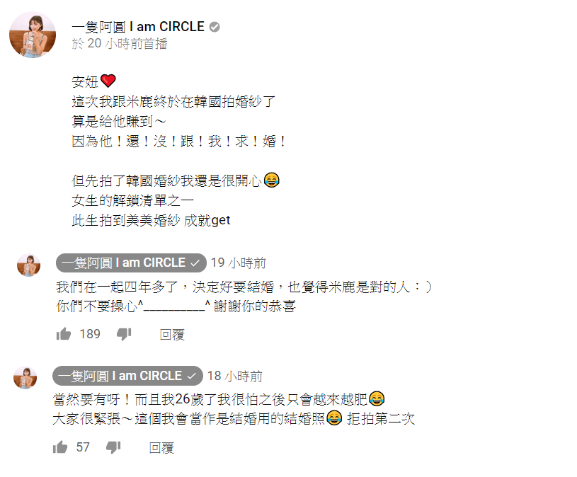儘管這次在韓國的婚紗體驗是與婚紗業者合作的「業配」,不過「阿圓」也現身宣佈了自己的好事將近,並表明「我們在一起四年多了,決定好要結婚,也覺得米鹿是對的人」、「這個我會當作是結婚用的結婚照」,言談間也洋溢著滿滿的幸褔,也算是提前曝光了婚紗照和婚訊。