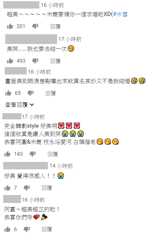 在「阿圓」和米鹿拍攝婚紗的過程,兩人甜蜜的互動、相視而笑都洋溢著滿滿的幸福和浪漫,儘管當時首爾只有零下8度,仍然無法減滅兩人愉快的心情,而這樣的氛圍也洋溢到了螢光幕前看影片的網友身上,紛紛表示「超美~~~~~米鹿要補你一個求婚啦XD」、「美哭......我也要去結一次」、「畫面美到眼淚差點噴出來欸莫名其妙又不是我結婚」。