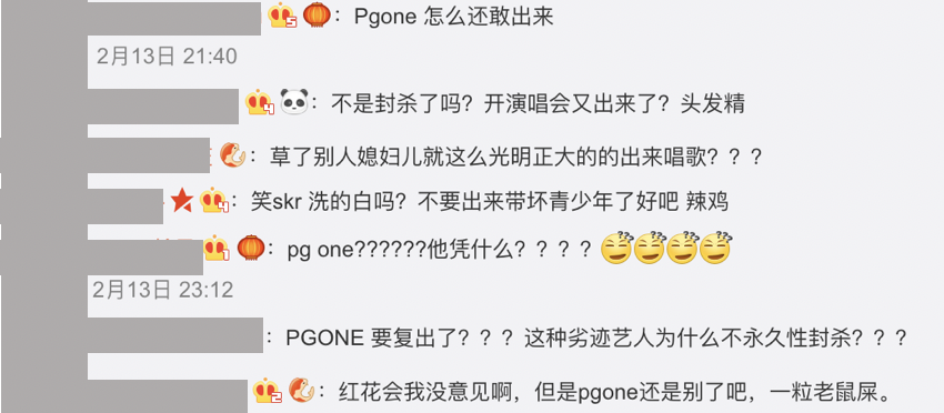 紅花會宣布回到西安開唱,許多粉絲們卻開始抵制PG One參與,紛紛留言:「PGONE 要復出了?這種劣跡藝人為什麼不永久性封殺?」、「紅花會我沒意見啊,但是pgone還是別了吧,一粒老鼠屎」、「pg one?他憑什麼」、「Pgone 怎麼還敢出來」、「搶了別人媳婦兒就這麼光明正大的的出來唱歌???」、「不是封殺了嗎?開演唱會又出來了?」、「洗的白嗎?不要出來帶壞青少年了好吧」