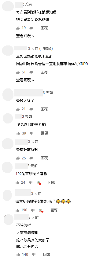 因為草爺本身有家室,網友紛紛留言:「每次看到她那樣都想知道 她女兒看到會怎麼想」、「草嫂應該很氣吧!草爺 因為呵呵因為蕾拉一直用胸部來頂你」、「男生真的要好好保護自己」、「沒見過那麼三八的」、「這集所有嫂子都跳起來了」、「不管怎樣 人家有老婆耶,這個效果真的太多了」。