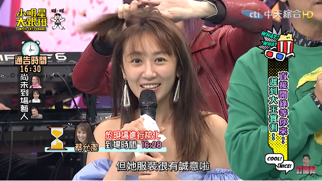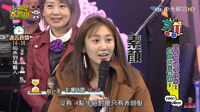 通告時間4點半,蔡小潔4點28分戴著墨鏡現身,還頂著一頭亂髮和大素顏。不過墨鏡一拿下來,蔡小潔皮膚狀況保養得很好,除了眼睛比較暗沉一點點,幾乎沒有任何瑕疵,就連吳宗憲也大讚:「你素顏很漂亮!」