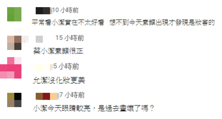 原本討論遲到的主題,網友們卻紛紛歪樓留言:「蔡小潔素顏好正」、「平常看小潔實在不太好看,想不到今天素顏出現才發現是妝害的」、「允潔沒化妝更美」、「小潔今天眼睛較亮,是過去畫壞了嗎?」