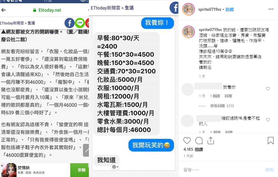 近日有網友在臉書社團PO出對話截圖,只見男方原本霸氣對她說:「我養你!」,怎料她接著超理性列出自己的月開銷,三餐、交通、化妝品、衣服、房租、水電等等項目,加起來總計四萬六,也因為金額不堪負荷,讓追求者立刻龜縮表示:「我開玩笑的」,此文一出也引發熱議。而雪碧昨也針對這篇文打上自己的開銷!