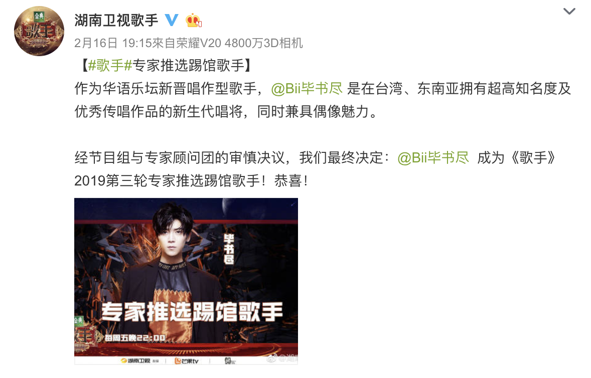 大陸綜藝節目《歌手2019》自1月開播後話題不斷,目前已經結束2輪比賽,隨著新一輪比賽展開,而節目再淘汰選手後,也會進行補位的動作,13日時,官方也正式宣布金曲歌后「楊乃文」補位加入。然而在16日時,官方公開下一批踢館選手,同為來自台灣的歌唱好手「畢書盡」將登場踢館,卻引起眾多的反彈聲浪。