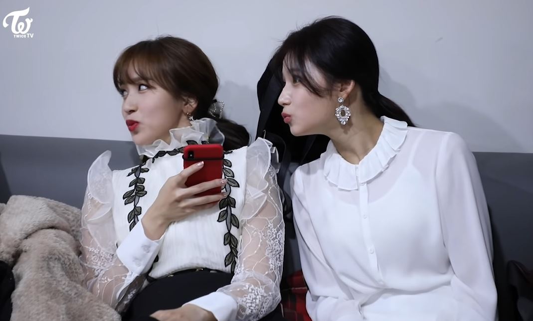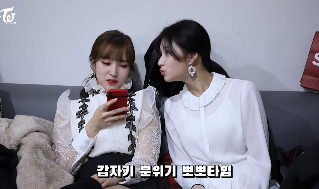 去年12月28日,TWICE參與由韓國電視台KBS舉行的年末節目《歌謠大祝祭》,15日,也透過TWICE官方YouTube推出幕後花絮,影片中除有TWICE新勤練舞的片段,其中,Sana和Mina在沙發上坐著休息時,Mina低頭滑著手機,Sana就抓緊機會想趁機偷親Mina的臉頰,眼看嘟起嘴的Sana都快碰到Mina了,沒想到機靈的Mina馬上發現就迅速閃開,尷尬氣氛讓兩人都忍不住笑了。