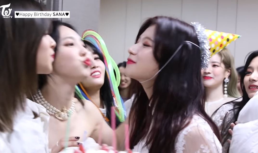 碰巧Sana的生日就在12月29日,為此,TWICE也在休息空檔在後台為Sana慶生,眼看定延手裡捧著生日蛋糕,其他成員也都安靜躲進角落,直至Sana現身後才開始唱歌,子瑜也貼心替她戴上慶生帽子,就在唱完歌曲後,娜璉竟沾起奶油往Sana臉上抹,不過Sana這時也抓緊機會向成員一一索吻,似乎也彌補了剛剛偷親Mina失敗的窘境。