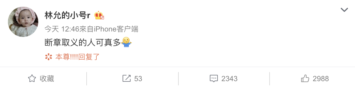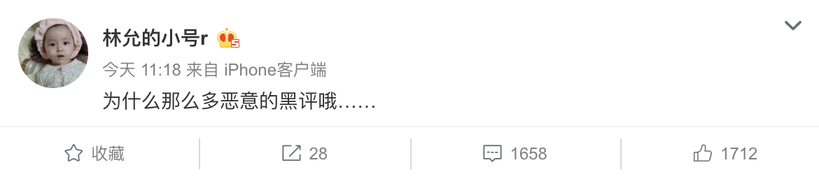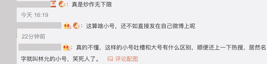 但在昨日與今日時,她分別寫下:「為什麼那麼多惡意的黑評哦…… 」、「斷章取義的人可真多」,隨即立刻登上熱搜榜,有網友不理解她為什麼要不斷用小號發牢騷,甚至說出她是不是有多重人格,也有網友提出疑問,說道:「既然是小號為什麼還要標注那麼清楚,小號不是應該不讓別人發現嗎」,認為她有有炒作話題的嫌疑。
