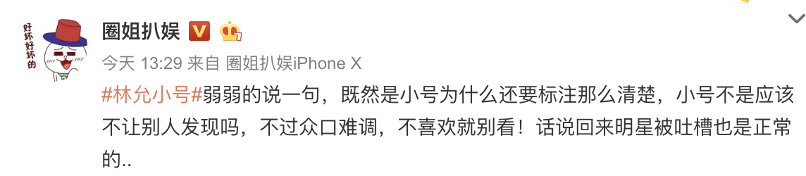 林允過去也多次因在小號上的發文而登上熱搜榜,這次因為寫下對於黑特評論的牢騷,也意外引發眾多網友們更多的批評。