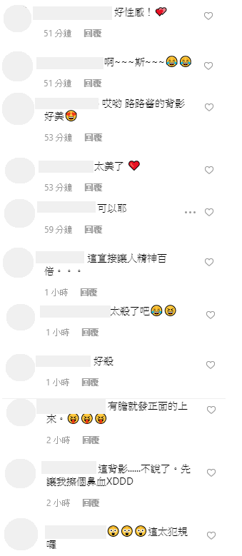 只見粉絲紛紛留言:「好性感!」、「哎哟 路路酱的背影好美」、「這直接讓人精神百倍」、「太殺了吧」、「超美的背影~」、「有膽就發正面的上來。」、「這背影......不說了。先讓我擦個鼻血」、「這太犯規囉」、「這個讓人血脈噴張阿」。