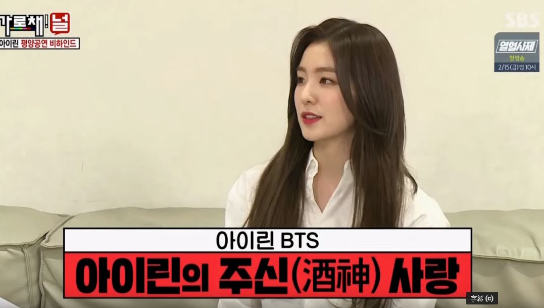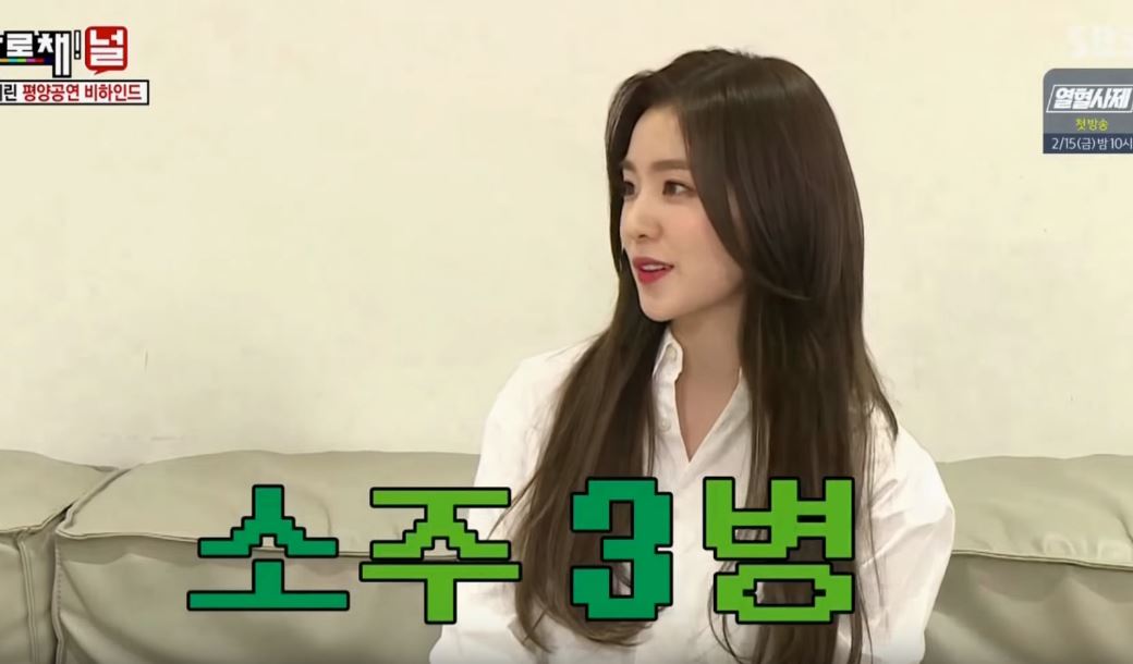 韓國女團Red Velvet隊長Irene標誌外表一直讓他攻佔韓國各大外貌排行榜,近期更接棒IU成為韓國燒酒品牌「真露」的代言,上月15日播出後一個月至今已有超過1,300萬的觀看次。14日,Irene現身SBS的節目《擄獲芳心頻道》,主持人姜虎東就好奇私底下的Irene酒量是否很好,而Irene除曝光喝酒癖好其驚人酒量也讓粉絲大開眼界。