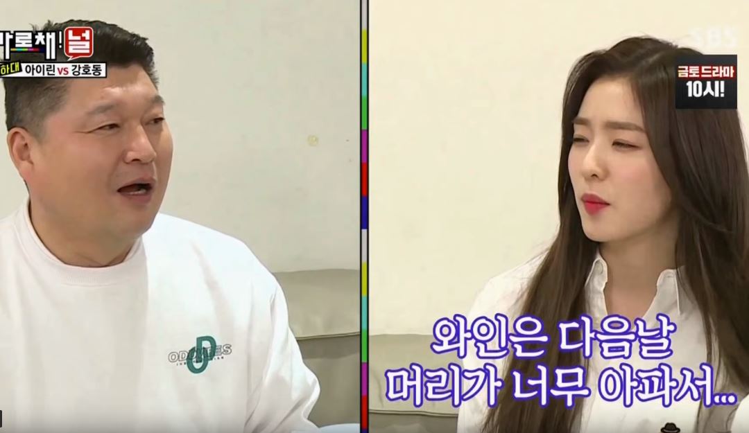 對此,姜虎東則回應「很多藝人都蠻喜歡紅酒的」,不過Irene卻透露自己平時絕不喝紅酒,並解釋「因為喝了會頭暈」,姜虎東一聽現場笑翻,他為Irene突破盲點說到「這是因為你混著其他酒一起喝了啦」。