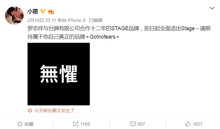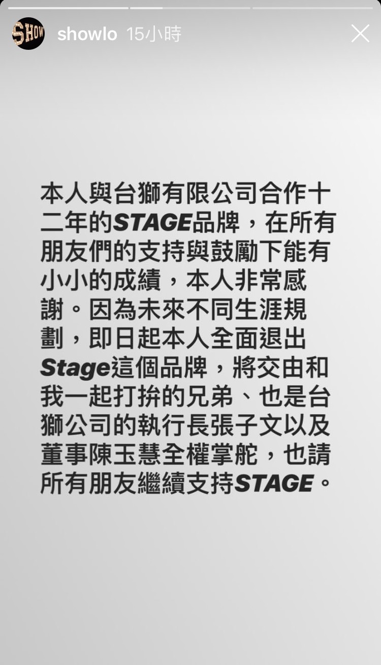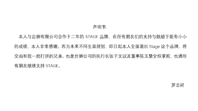 2006年時羅志祥自創了一個品牌「STAGE」,至今已經12年的時間,品牌經營的有聲有色,除了在台北開店外,在海、香港、北京、武漢、南寧和新加坡等不同城市也都有開店,成功跨界。近日卻無預警宣布將正式退出STAGE,他表示,「因為未來不同生涯規劃,即日起本人全面退出STAGE這個品牌,將交由和我一起打拼的兄弟、也是台獅公司的執行長張子文以及董事陳玉慧全權掌舵,也請所有朋友繼續支持STAGE」,隨後,STAGE團隊也在臉書上證實此事。