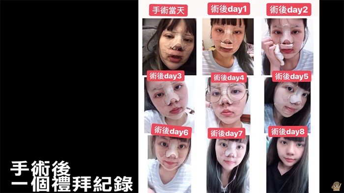 雖然當天非常紅腫,不過超直白的恢復非常快,在手術第八天,就已經拆掉了臉上的紗布,可以看見拆了紗布後,超直白的眼睛明顯變得更大,鼻子變得又尖又挺,下巴延伸到臉的輪廓也變得更加鮮明,手術可說是十分成功!