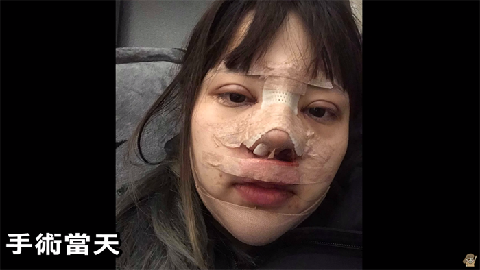 這次幫超直白做整型手術的醫生,便是業界有名的李進良醫生,在和超直白講解整形的做法之後,便開始進行手術!只見躺在床上後超直白也十分緊張,還要求好友和她講笑話分散注意力,後來直至當天晚上八點手術才完成,她也記錄下剛剛完成手術的自己,可以看到她的臉上貼著紗布,眼睛鼻子下巴也都因為手術而紅腫,模樣十分驚人。