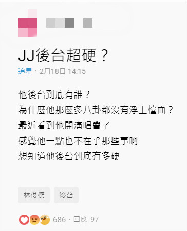 「金曲歌王」林俊傑出道16年,演藝事業屢創高峰,甚至還有「行走CD」的美名。不過在感情方面,林俊傑有過不少花邊新聞,但似乎很多八卦都沒有浮上新聞檯面,或者短短時間就落幕,有網友在Dcard發文提問,「想知道他後台到底有多硬?」引起網友熱烈討論,甚至還有網友爆:「估狗就有了吧,看一下他爸媽爺爺一代是做什麼的吧!去去去。」