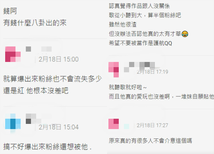 不過許多粉絲仍認為「作品跟人沒關係」,才華是沒有辦法被否定的:「歌好聽就好~」、「我是真的覺得還好,我只是來聽歌的」、「我不是他的粉 只是喜歡聽他的歌,但我認為要說一個人人品怎麼樣,不可能空口說白話而已~」、「所以有哪個藝人沒有八卦嗎?有才華就是有才華,靠自己的歌聲走到今天」、「他的後台叫實力,謝謝」。