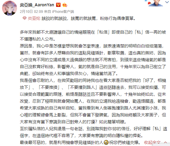 炎亞綸向來都很注重和粉絲的互動,在能力範圍內,都會親自回覆粉絲的私訊,不過卻遭到某些有心人士操作。前幾天他才在微博透露,「多年來我都不太避諱讓自己的情緒顯現在『私信』,即使自己的『私』信一再的被不懂隱私的人公布。」