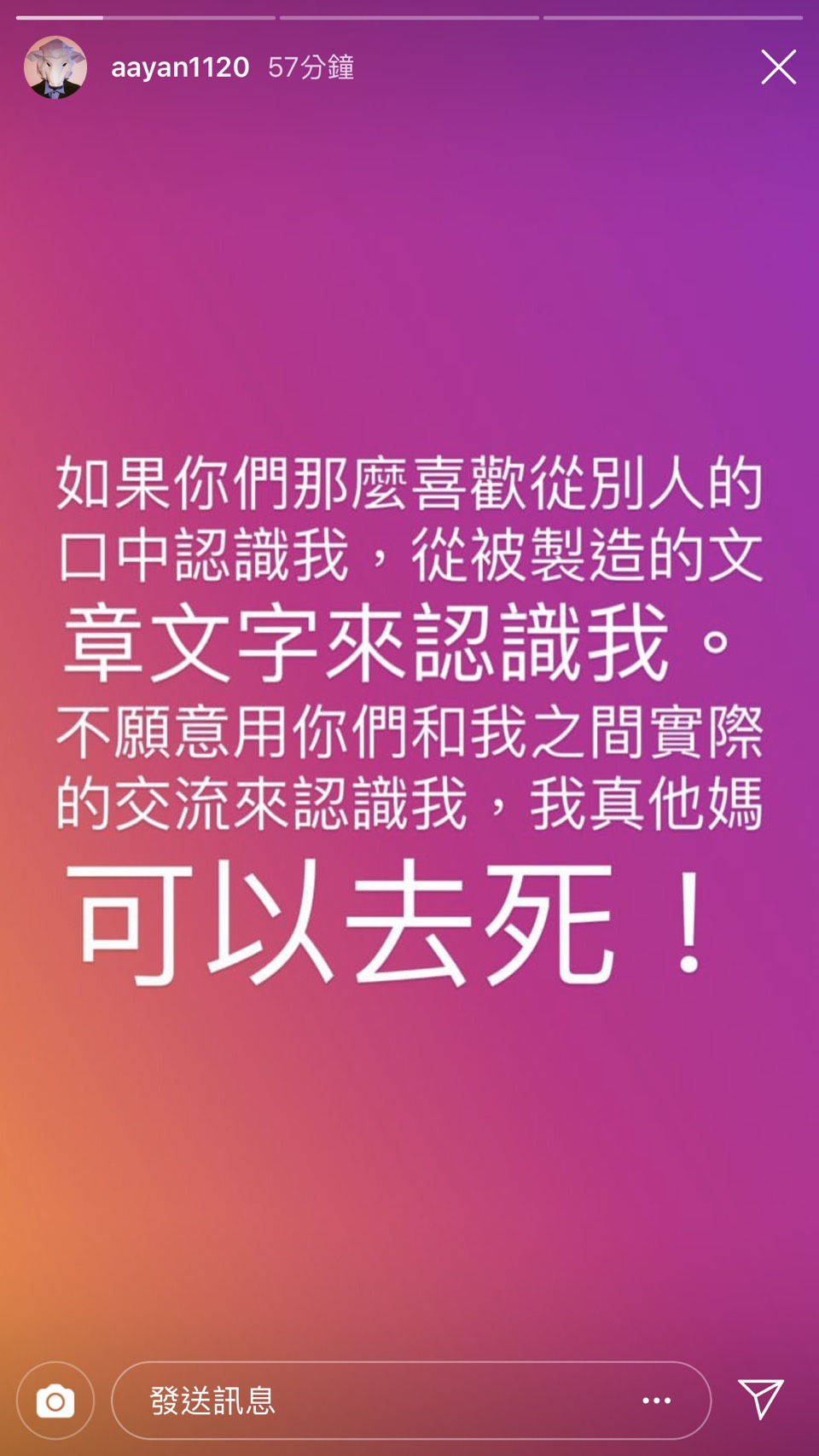 炎亞綸昨深夜疑似又再度陷入低潮,突然在IG限時動態發文表示,「如果你們那麼喜歡從別人的口中認識我,從被製造的文章文字來認識我。不願意用你們和我之間實際的交流來認識我,我真他媽可以去死!」疑似有粉絲曬出和他的私訊,並遭有心人士製造了一些文字,讓他感到不被尊重而不開心。