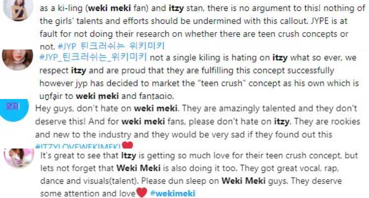 12日,ITZY正式出道後也陸續登上電視台Mnet、KBS 2TV、MBC 和 SBS的音樂節目,單曲《DALLA DALLA》目前也衝破5,000萬觀看次數,外界對於ITZY能否迅速搶下節目第一位都給予高度期待,對比兩團在演藝圈的表現,不免出現雙方粉絲爭議,然而也有部分Weki Meki粉絲理性認為,Teen Crush也並不是WeMe的專利。