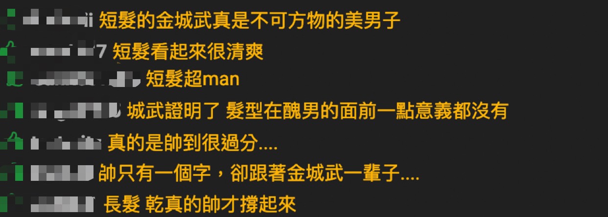 有網友在PTT表特版上寫下「短髮 v.s 長髮的金城武」,並個別附上多張照片,而底下的網友也紛紛發表評論:「短髮超man」、「短髮看起來很清爽」、「短髮的金城武真是不可方物的美男子」、「長髮 乾真的帥才撐起來」,大多數網友都喜歡他短髮。也有網友相當搞笑的留言:「你怎麼有那麼多我的照片」、「謝謝大家對我的支持」、「我真的很帥ㄟ」,該篇推文近一百則,留言處相當有趣。