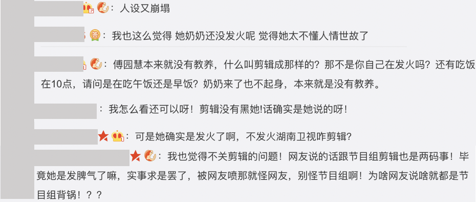 許多網友認為她就是沒有教養,說道:「什麼叫剪輯成那樣的?那不是你自己在發火嗎?還有吃飯在10點,請問是在吃午飯還是早飯?奶奶來了也不起身,本來就是沒有教養」、「我怎麼看還可以呀!剪輯沒有黑她!話確實是她說的呀!」、「我也覺得不關剪輯的問題!網友說的話跟節目組剪輯也是兩碼事!畢竟她是發脾氣了嘛,實事求是罷了」,大部分的網友認為節目剪輯並沒有惡意黑她。