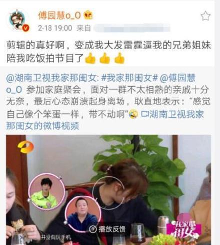 在等了近三小時後,傅園慧受不了起身大吼:「他們好了沒有」,情緒大爆發,而之後大家低頭吃飯時氣氛相當尷尬,傅園慧發現自己無法挽救冷場的場面後就直接離席,這些舉動也被網友們各種批評。而在18號晚間時,傅園慧在微博上轉發該節目片段,並寫下:「剪輯的真好啊,變成我大發雷霆逼我的兄弟姐妹陪我吃飯拍節目了」,吐槽節目隨意剪輯,她隨即又刪除文章,但卻依然被網友截圖後討論。
