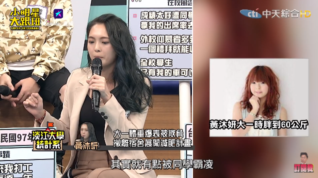 28歲的小豬(黃沐妍)2013年憑藉著綜藝節目《神馬好時光》出道,近年來在演藝圈中的表現可圈可點,主持外景節目也備受肯定。日前她在節目上透露,當年她剛讀大學,因為整天就只知道讀書,體重因此飆破60幾公斤,甚至還被室友霸凌。