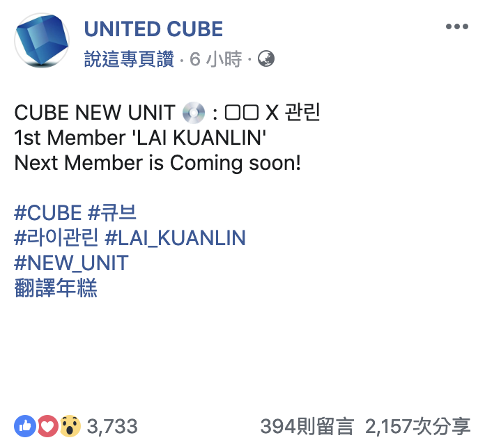 今日下午時,CUBE宣布新的子團體首位成員即是賴冠霖,其餘的成員將在日後慢慢公布,而網友看見此消息後表示:「期待賴冠霖!」、「太期待啦」、「真好,cube真會挑人」,而有粉絲發現貼文寫道「□□ X 冠霖」的韓文,認為這可能是團名,且子團人數可能只有2人,粉絲也紛紛猜測同為《Produce 101》出身的「柳善皓」可能就是子團人選,讓粉絲們相當的興奮與期待。