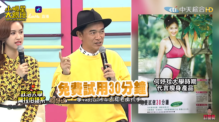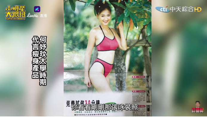 何妤玟大學時期就曾代言過瘦身產品,只見她穿著兩截式的比基尼站在大樹旁,露出燦爛的笑容,皮膚白皙四肢相當纖細,小腹也非常平坦,只不過吳宗憲卻發現有哪裡不太對勁:「問題是一個女孩子貼在那邊,上面讓人家寫著『免費試用30分鐘』…」何妤玟自己聽了也傻眼,Sandy還在旁邊補一槍:「太好了吧!30分鐘很久欸~」