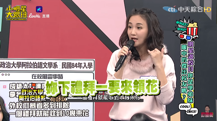 當年何妤玟更是學校裡的風雲人物,還有校外的仰慕者天天開跑車送花給她, 追求者甚至還要排隊,一個禮拜就能收到10幾束的鮮花。甚至有次因為演藝工作太忙,一個禮拜沒有去學校,老師還打電話通知她:「妳下禮拜一要來領花,因為花快臭掉了。」連Sandy聽了都忍不住說:「這講出來多臭屁啊!」