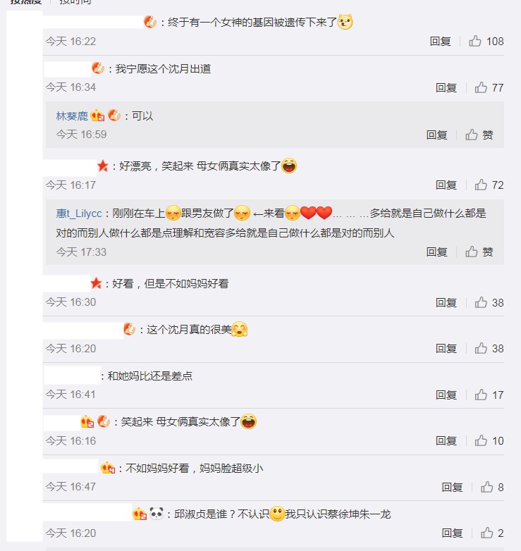 睽違兩年再度露面,19歲的沈月擺脫稚氣,全身散發出小女人的韻味,走起台步,有模有樣,穿搭相當有自己的風格,睽違兩年再度露面吸引大批網友轉發,也紛紛留言「太美了。媽媽很嫵媚她更可愛」、「她好漂亮」、「終於有一個女神的基因被遺傳下來了」、「好漂亮,笑起來 母女倆真實太像了」、「這個沈月真的很美」、「這個臉好,跟媽媽一樣美」讚嘆沈月的美貌。