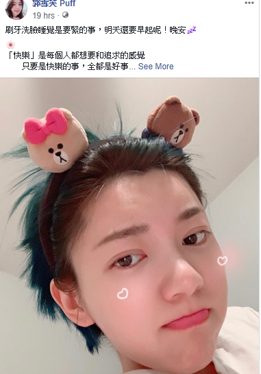 新聞爆發後,人在美國度假的郭雪芙,昨(20)日接連發出2篇貼文,第一篇發了一堆鬼臉圖案和無奈的表情,還附上一張蹲在角落的照片,似乎正是她心情的寫照;接著她引用泰國暢銷作家努姆.塔沙那的作者序,寫著「『快樂』是每個人都想要和追求的感覺,只要是快樂的事,全都是好事,要是不會對別人造成困擾的快樂,是讓自己開懷大笑的快樂」、「接納生活中曾忽視的小小事件,讓每一秒的呼吸,都充滿快樂,也就是讓自己活得很『值得』」。