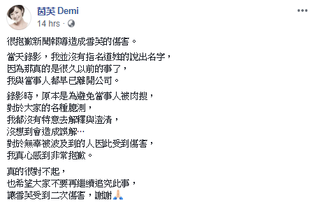 事後茵芙也發文澄清,一開頭就寫著「很抱歉新聞報導造成雪芙的傷害」,她解釋,錄影當天她並沒有指名道姓說出名字,「因為那真的是很久以前的事了,我與當事人都早已離開公司」。且錄影時,就是怕當事人被肉搜,所以對於大家的臆測,她都沒有多做解釋,沒想到卻因此造成了誤會,甚至波及無辜,「真的對不起,也希望大家不要再繼續追究此事,讓雪芙受到二次傷害,謝謝。」
